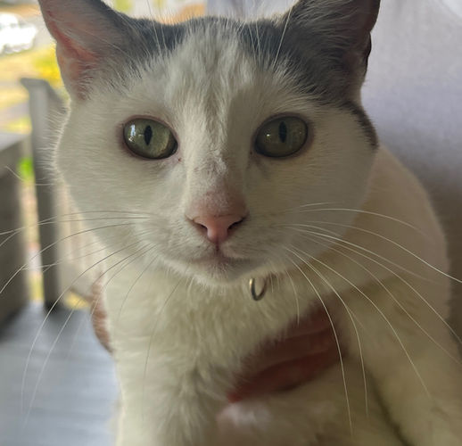 She’s the type of kitty who enjoys simple comforts: soft blankets, warm spots to curl up in, and a window with something interesting to watch. She’ll happily spend her days snoozing, cuddling, or chirping a sweet hello when you walk into the room.She loves wet food, enjoys making biscuits when she’s extra happy, and has a playful side that comes out when crinkly toys or little balls are nearby. She’s also a shoulder climber, which makes her extra charming. While she may hide if she feels overwhelmed and can get a little spicy at the vet, she bonds well once she feels secure.
